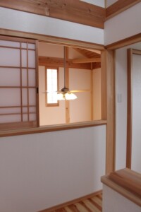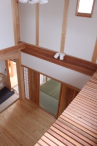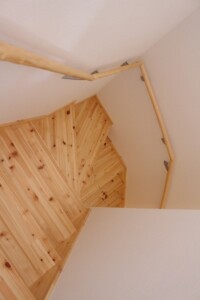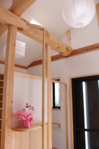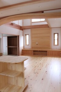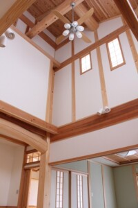 ご家族の希望を取り入れながら一緒にアイデアを出し合い無垢の木を使った、吹き抜のある家が完成しました。