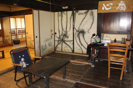 家の中には、心躍るような書の作品が飾られ、新しく設置した窓からは自然そのままの石垣と苔を眺めることができます。